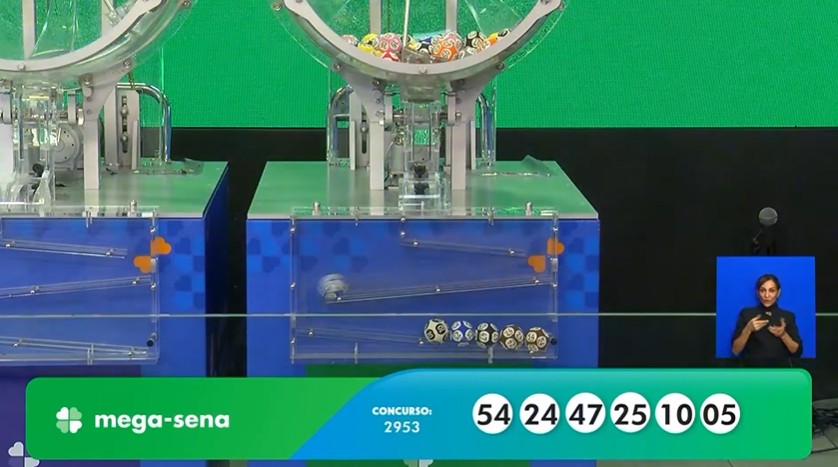 Números da Mega-Sena 2953 de hoje: 05, 10, 24, 25, 47, 54.
