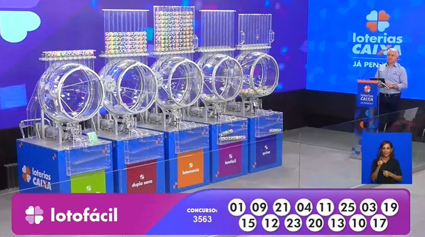 Números sorteados na Lotofácil 3563 de hoje: 01, 03, 04, 09, 10, 11, 12, 13, 15, 17, 19, 20, 21, 23, 25.